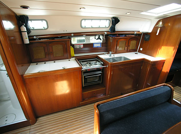 Across to port is the spacious galley. With a Corian style counter top, and "tons" of storage. Starting from the forward end, there is a large working countertop area with storage underneath. A deep double S.S. sink with hot and cold pressure water. Then a gimbaled two burner propane stove with oven, S.S. holding bar in front of the stove, then next aft is the huge top loading refrigerator/freezer with Frigomat cold plate refrigeration.