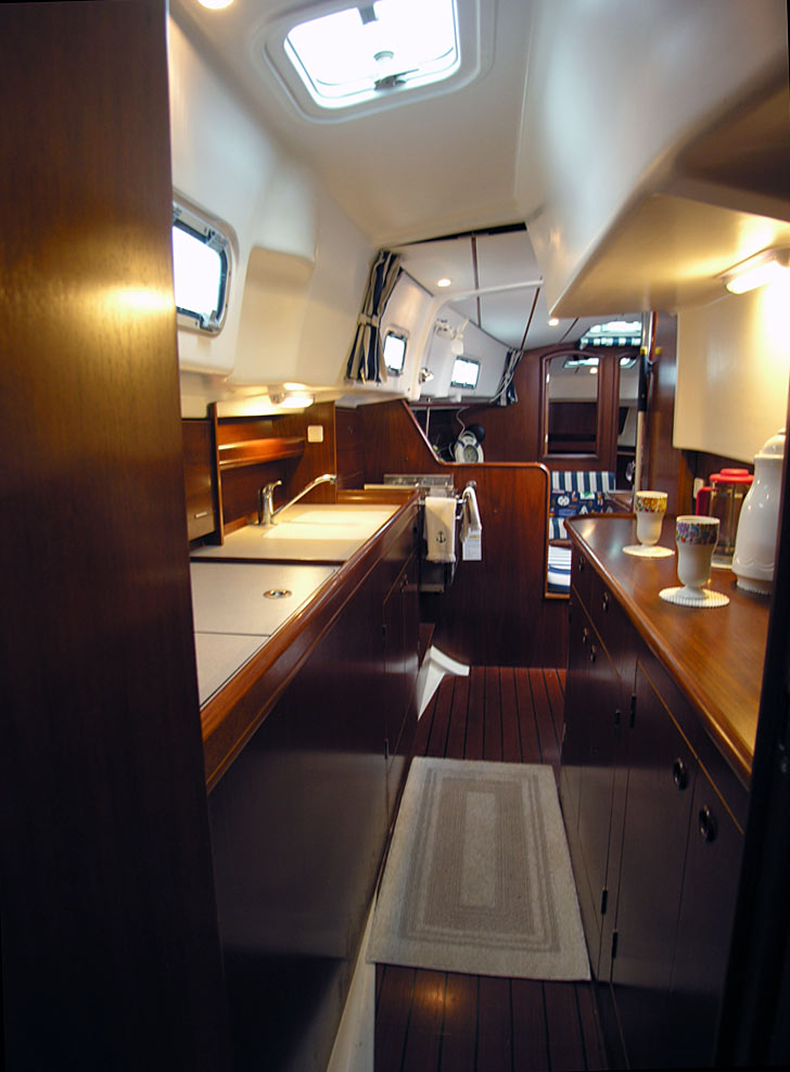 The walk through galley features a huge icebox with refrigeration with freezer along the outside edge, with a double sink and gimbaled propane stove with oven. The first owner never used the stove. There is lots of storage in the built-in cabinets behind the counter along the whole length of the galley. The other side of the galley features a huge counter space for working, with a ton of additional storage built-in along the whole length.