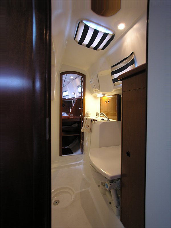 To starboard of the companionway is the walk through head. With private access from the master stateroom and guest access from the salon. With opening ports and an opening hatch (with privacy screens ....), it is a very comfortable and functional space. She has a shower, shower sump, sink with vanity and mirror and plenty of storage. There is a fold down seat over the head for sit down showers. Very nice.