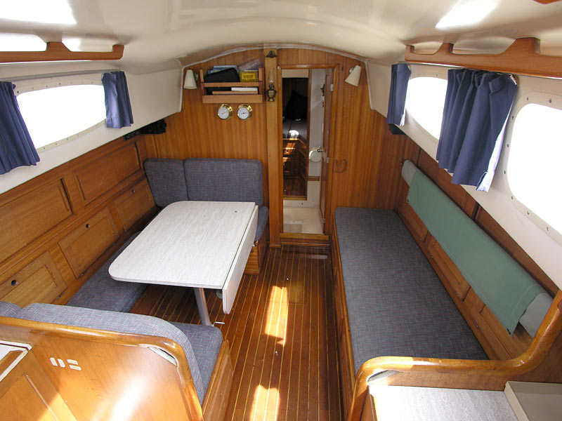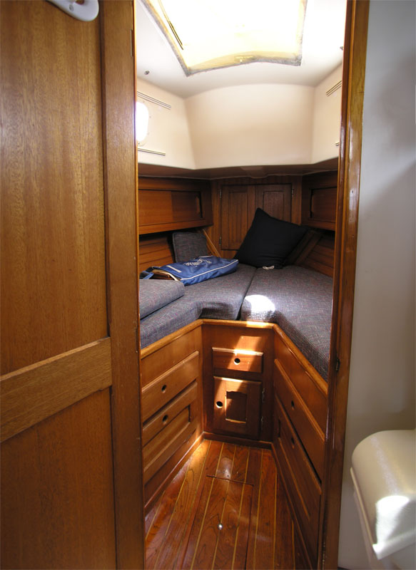Accommodations Interior is clean, light and open with accommodations for six. All of the cushions throughout the boat have been recovered and are in excellent condition. Double V-berth stateroom forward, with new comfortable cushions and a filler cushion. Next aft is the head with the vanity and the head across, shower sump. There is a privacy door on the head, and you can separate the vee from the rest of the boat. The dinette on port, converts to a double berth, with a single settee berth opposite the dinette. The sixth berth is a removable upper single pipe berth above the starboard settee. Navigator's station with light, U-shaped dinette. Extensive storage includes: 44 interior lockers, 2 hanging lockers, 2 large cockpit lockers, lazarette locker, and an anchor chain locker forward. Interior decor: beautiful mahogany interior joinerwork, 1993 blue fabric on cushions and throw pillows (excellent condition), white curtains, teak and holly cabin sole. Ventilation is provided by: 2 hatches, 1 opening port, and 2 dorade vents (all with screens). |