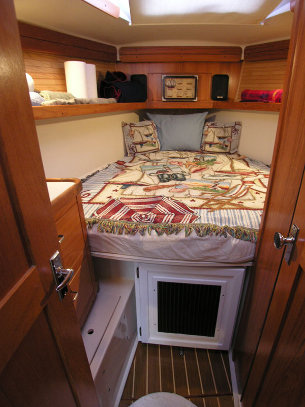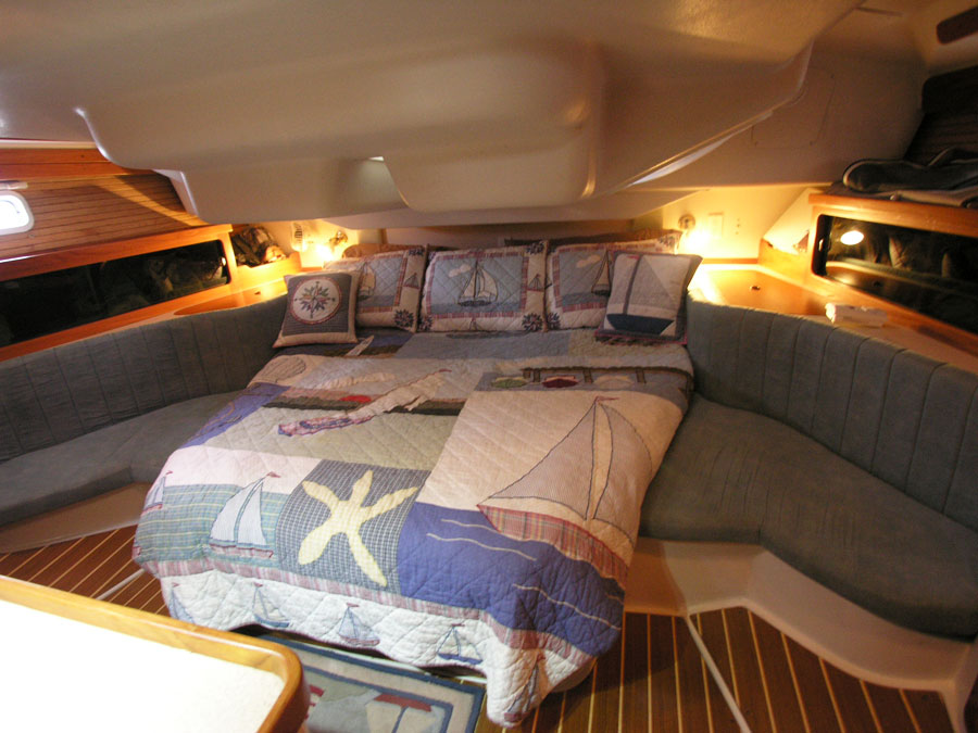 Starting aft, the master stateroom is ideal. A walk around over sized centerline berth, with room for you to get in and out of your own side of the berth without crawling over anyone. Room to stand up and get dressed, room to sit on the edge of the bed ...Tons of storage. Hanging lockers on both side, lots of shelves and cabinets. A great boat for cruising, or living aboard. There is a custom innerspring mattress by the Handcrafted Mattress Company new in 2000. New custom sheets for both the fore and aft staterooms new in 2010.