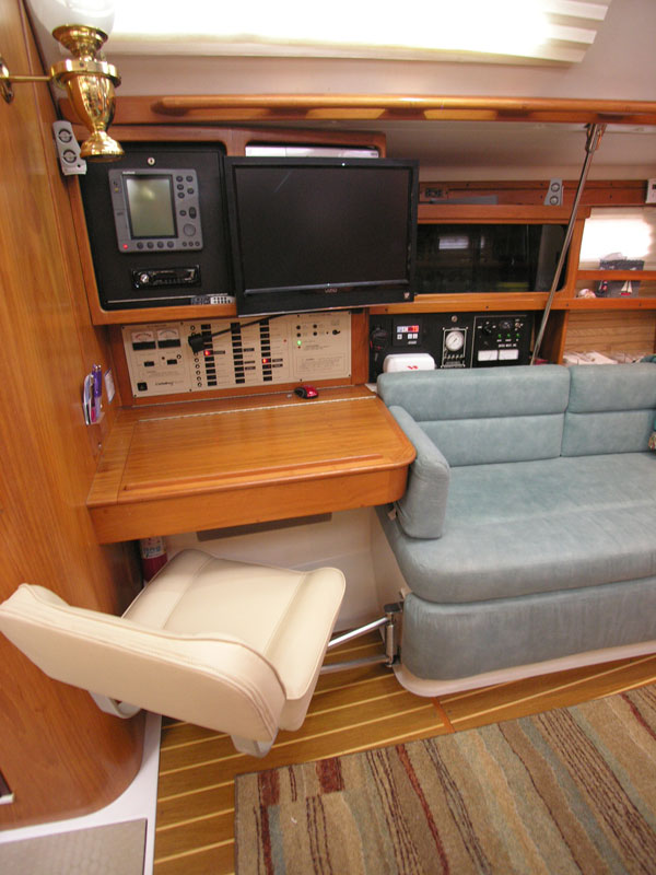 Across from the galley and to port is the nav station. There is a comfortable