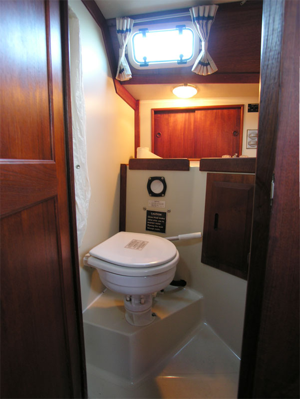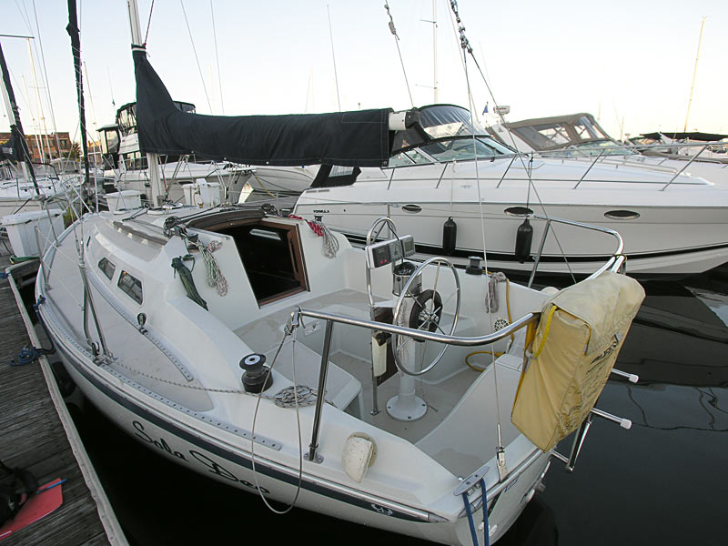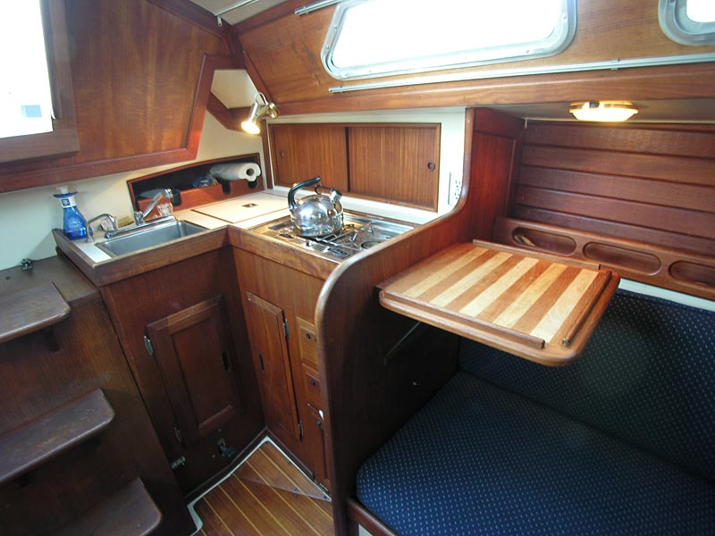 Manual bilge pump This is the desirable T-shaped cockpit with room to move around the wheel. The helm seat is mold in for comfort and stability for the helmsman. There is a folding teak table for the pedestal, and the instruments are mounted at the helm for maximum visibility. Lifesling |