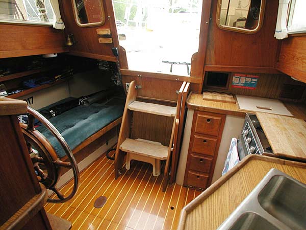 The Gulf-32 is designed to provide maximum comfort below decks in all weather conditions. The starboard side of the pilothouse has a sit-down chart table and shelves for the navigator. Behind the chart table is a large quarter berth. The inside steering station is located amidships alongside the chart table with its own set of engine controls, and compass. Autopilot controls are recessed into the chart table adjacent to the steering station, allowing hands-free push button steering as well. A remote control allows autopilot steering from the cockpit. A station exchanger allows steering from either steering station with the other station disengaged. The autopilot can be active with either steering station in use. From the inside steering station, the helmsman has 360 degree visibility and complete control of the boat when under power while remaining protected from the elements.