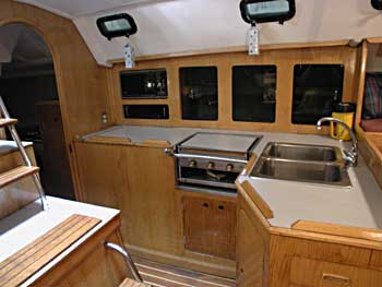 The galley is aft to port and is arranged along the port passageway into the aft cabin. There is a two burner gimballed CNG stove and a built-in microwave. This makes for a great sea galley, usable under any conditions. To port of the galley is a full nav station with a seat that stores underneath and swings out for usage. Next aft to port is a huge walk through head with separate shower area, shower sump and hot and cold pressure water.