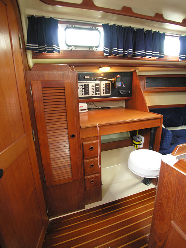 Aft of the settee on the port side is the outboard facing nav station. The navigator's seat pivots out for use, and then back under for storage and locks in position both times. This is also the electrical hub for the boat, with an electrical panel that hinges out for access and locks closed. There is plenty of room for addition nav instruments.