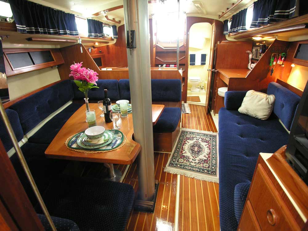 Her classic lines attract you at the dock. And as you go below, the first thing that you notice is the beautiful woodwork and the teak and holly cabin sole throughout the boat. The rich dark blue upholstery sets of the wood perfectly and gives you that classic feeling as you enter. The interior is warm and welcoming. Lots of opening ports and large hatches, give you the light and ventilation that you always hoped for. There are custom made dark blue with white trim curtains made for the entire boat for privacy and beauty. The cabin sole was completely refinished in 2006.