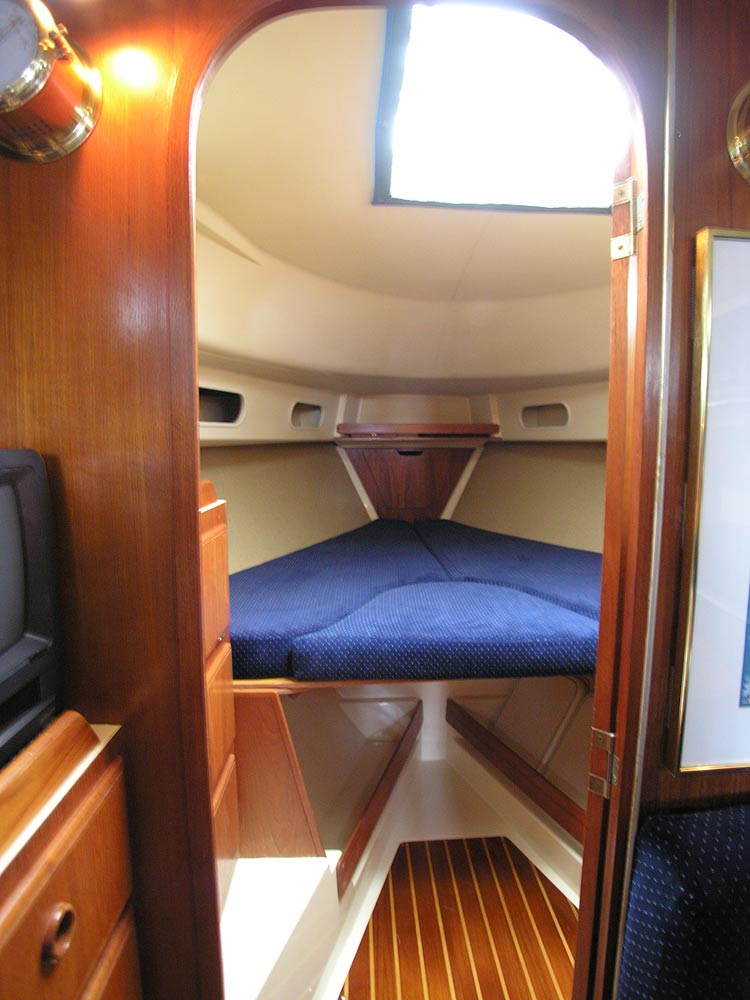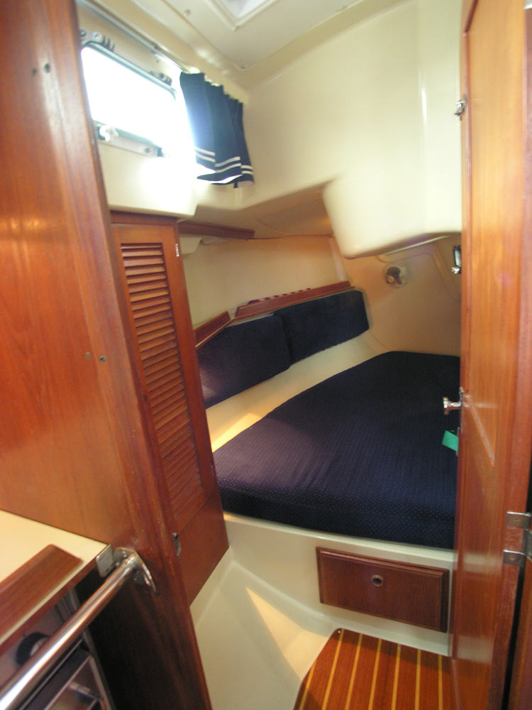 Starting forward, there is a forward stateroom with a vee berth and a filler cushion. There are cubby holes all around the sides of the berth, storage racks under (perfect for seabags) and a shelf in the bow .... giving you lots of secure storage for your books, glasses and other needs. To port there is a built in storage bureau ... it looks like drawers, but actually opens to reveal a wonderful set of oh so useful shelves. To starboard, you find a hanging locker. With a large overhead hatch with screen and vent, and two opening ports, the stateroom is spacious and comfortable. With the filler cushion in place, there is still lots of room for dressing in privacy. The berth has custom cut white sheets with blue stripes, with a matching custom cut dark blue (the underside matches the sheets) comforter.