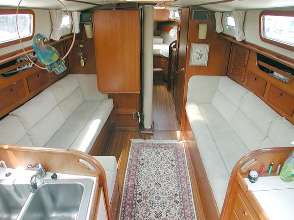 The interior is beautifully finished with rich satin varnished teak woodwork . The thick luxurious interior cushions are done in a subtle cream ultra suede which complements the rich wood for a warm traditional feel to the interior The teak and holly floor also adds to the rich effect, and the owner has the cabin sole varnished each year by Palmer Johnson. With her generous headroom ....... this is a roomy and spacious interior. There are two custom wood screens for the companionway, and screens for the hatches, and with 4 large opening overhead hatches, 8 opening ports and 6 dorade vents, this has to be one of the most airy and well ventilated boats ever.
