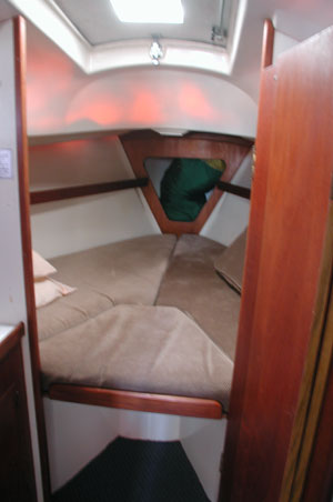 cushion and plenty of storage in forepeak, side shelves and under berth.
