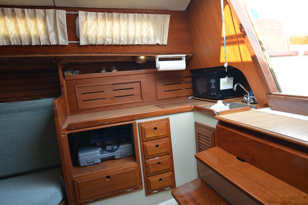 Across from the nav, to starboard of the companionway, is the U-shaped galley. Wrapping around from the companionway, first there is a deep S.S. sink with hot and cold pressure water. Next in the corner is the large icebox with refrigeration. A microwave is also mounted deep in the cubbyhole, with more storage next to it. Turning aft along the starboard side, is lots of counterspace including the space where the stove used to be. Storage is behind the whole space, and under as well.