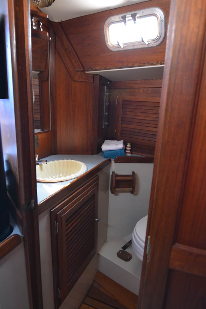 Next aft you find the very spacious head to port. Manual head with holding tank, sink with pressure water, a sump for a shower (not currently installed), and lots of storage. There is an opening port, and a mirror.