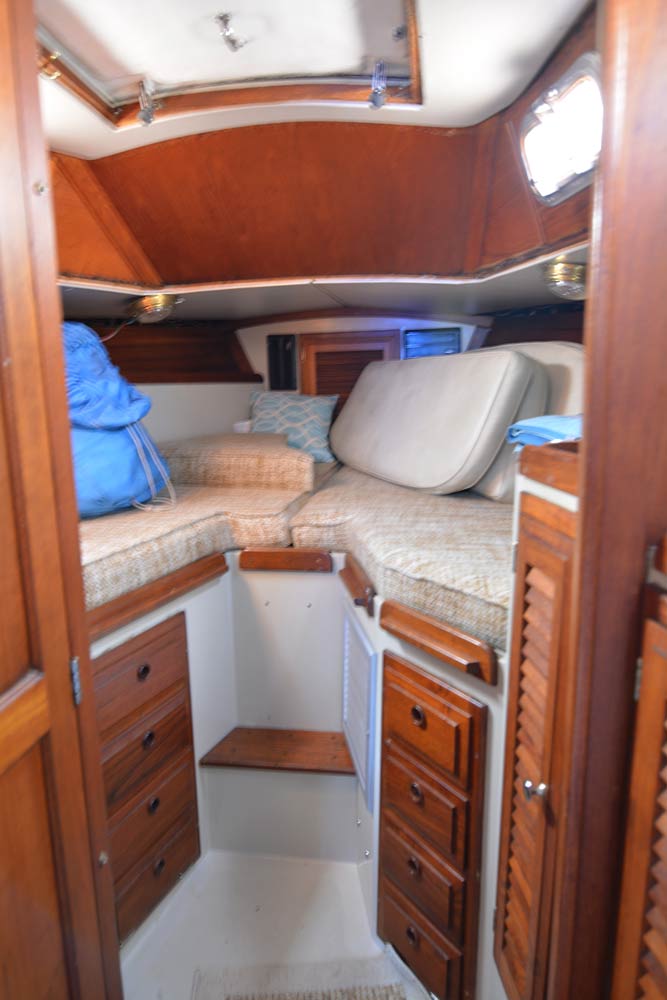 Starting forward in the vee berth, you find a very large berth that a filler cushion. In the very bow section, there is access to an anchor locker. Shelves are built in along both sides of the berth. Under the berth on each side, you find 3 drawers and a cupboard with a drop-down front. The starboard side also has a nice hanging locker. Overhead there is a large opening hatch, and with opening ports on both sides, the light and ventilation make this a very comfortable space.