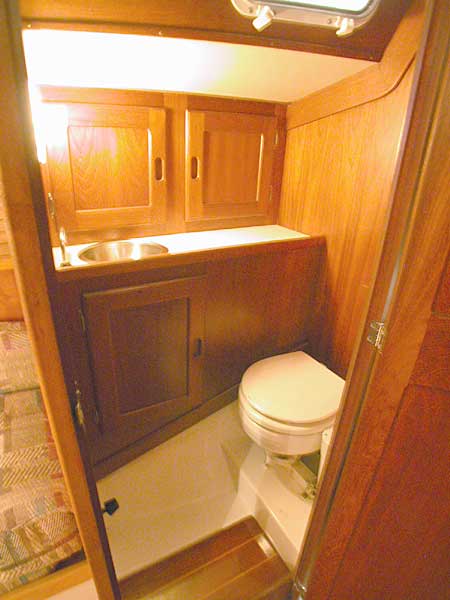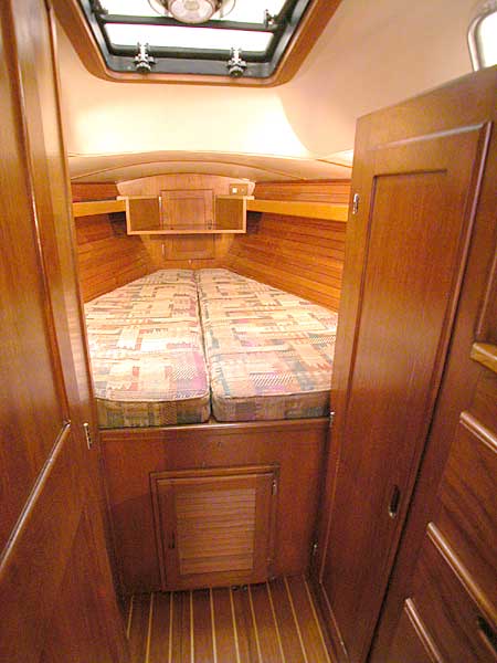 There is a spacious vee berth forward with storage underneath, accessible from either above or from the louvered door in the base. There are shelves completely around for your books, glasses, etc. The vee berth also has a custom designed wood shelf over the foot of the berth, for a television or other storage. There is also access to the anchor locker in the bow. Solar vent in hatch above V-berth (new in 2001, new battery 2005, and spare). Removable custom screen and sun shade for V-berth hatch