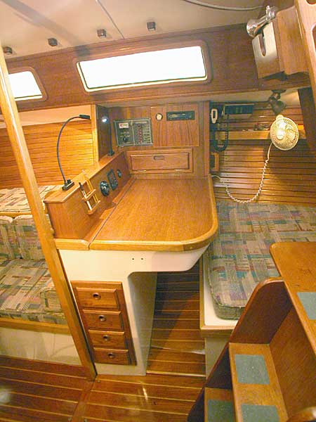 The nav station has more beautiful wood with an opening storage desk, flush mounts for the stereo and instruments. Behind the nav station is a roomy quarter berth. There are two convenient flexible lights, each with a dimmer for nighttime navigating.