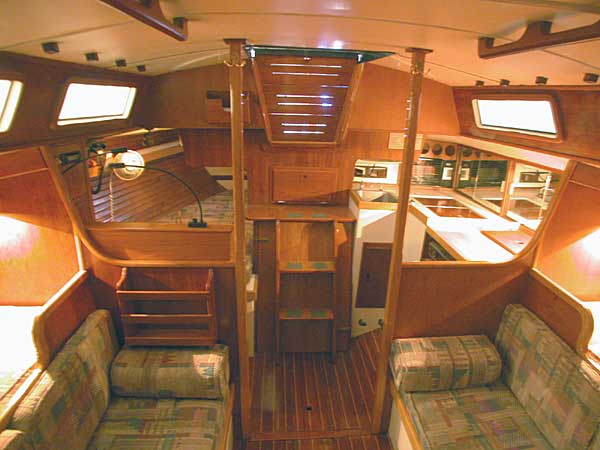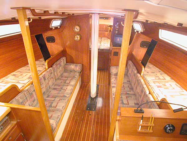 The salon has a traditional layout with settees to both port and starboard with pilot berths behind each. Custom built in hardware storage areas behind port and starboard seat backs. All cushions were redone in 1991 and are still in excellent condition. There is a newly varnished teak and holly cabin sole, brass clock and barometer, cedar lined hanging locker (done in 1999), ash and teak lee boards on the pilot berths, and beautiful lathe strips along the hull side for an elegant traditional look.. There is a unique dining table arrangement with the table hanging from the salon rails with ropes.... a very "nautical" look. Beautiful 4" x 10" deck prism lights port and starboard for an amazing amount of additional natural light in cabin